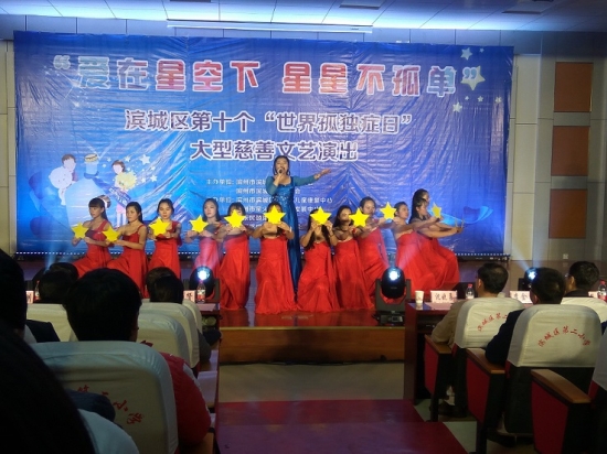 演出伊始,屏幕上播放的短片介绍了自闭症儿童的现状及金钥匙儿童康复中心的概况,使更多的人了解了自闭症儿童与金钥匙儿童康复中心。我院志愿者团队的歌伴舞《星星的孩子》,以优美的旋律,轻柔的舞姿向观众们表达了不歧视、不嘲讽“星星的孩子”的愿望以及对自闭症儿童能够像正常孩子一样生活的美好祝福。