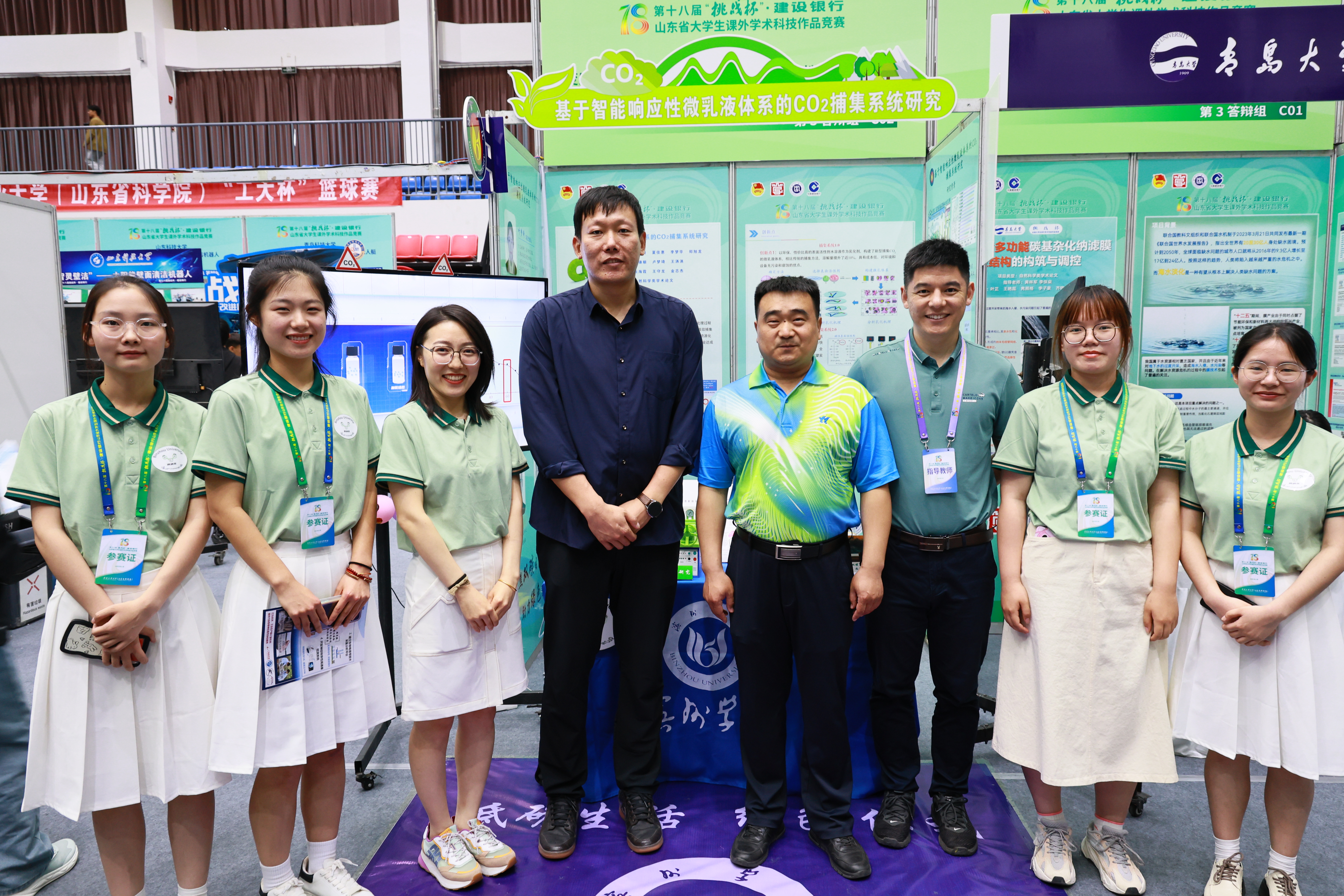 我院参赛的自然科学类论文作品《变废为宝,碳为灌植-基于智能响应性微乳液体系的二氧化碳捕集系统研究》由我院张海霞、王守龙、金志杰老师指导,叶梦绮等同学组建“O=C=O消消乐”团队参赛。该作品锚定习近平总书记的“双碳”计划,聚焦滨州地区企业多、碳排放量大等问题,构建了一种低成本、绿色高效的新型CO2捕集系统,且实现了捕集液的资源化利用。赛场上,我院师生展现了“自强不息、守正出奇”的学校精神,经过现场质询、问辩评审等激烈角逐环节,一路过关斩将,在本届“挑战杯”赛事中荣获山东省一等奖!实现了我院在挑战杯赛事中“自然科学类学术论文”组别的零突破。