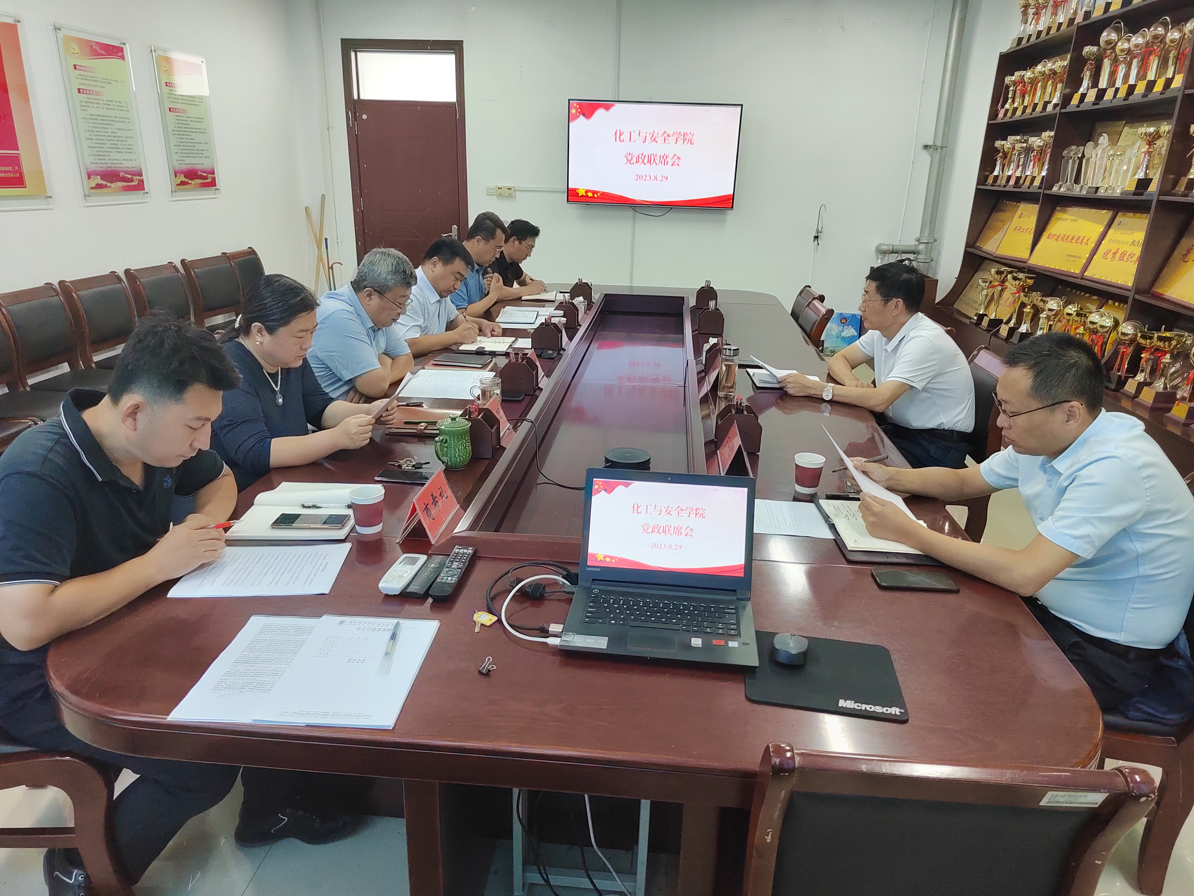 8月29日上午,化工与安全学院在8-316会议室开展党总支理论学习中心组2023年度第9次集体学习和党政联席会,学校党委委员、副校长孙银河列席旁听,学院党总支书记王建主持会议。
