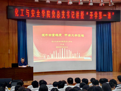 2024年9月24日,化工与安全学院于明德报告厅由党总支书记王建为全体2024级新生讲授开学第一课。学生科科长张岩冲主持活动,党总支副书记李芳、学生辅导员杜金双、姚斌及全体新生参与活动。