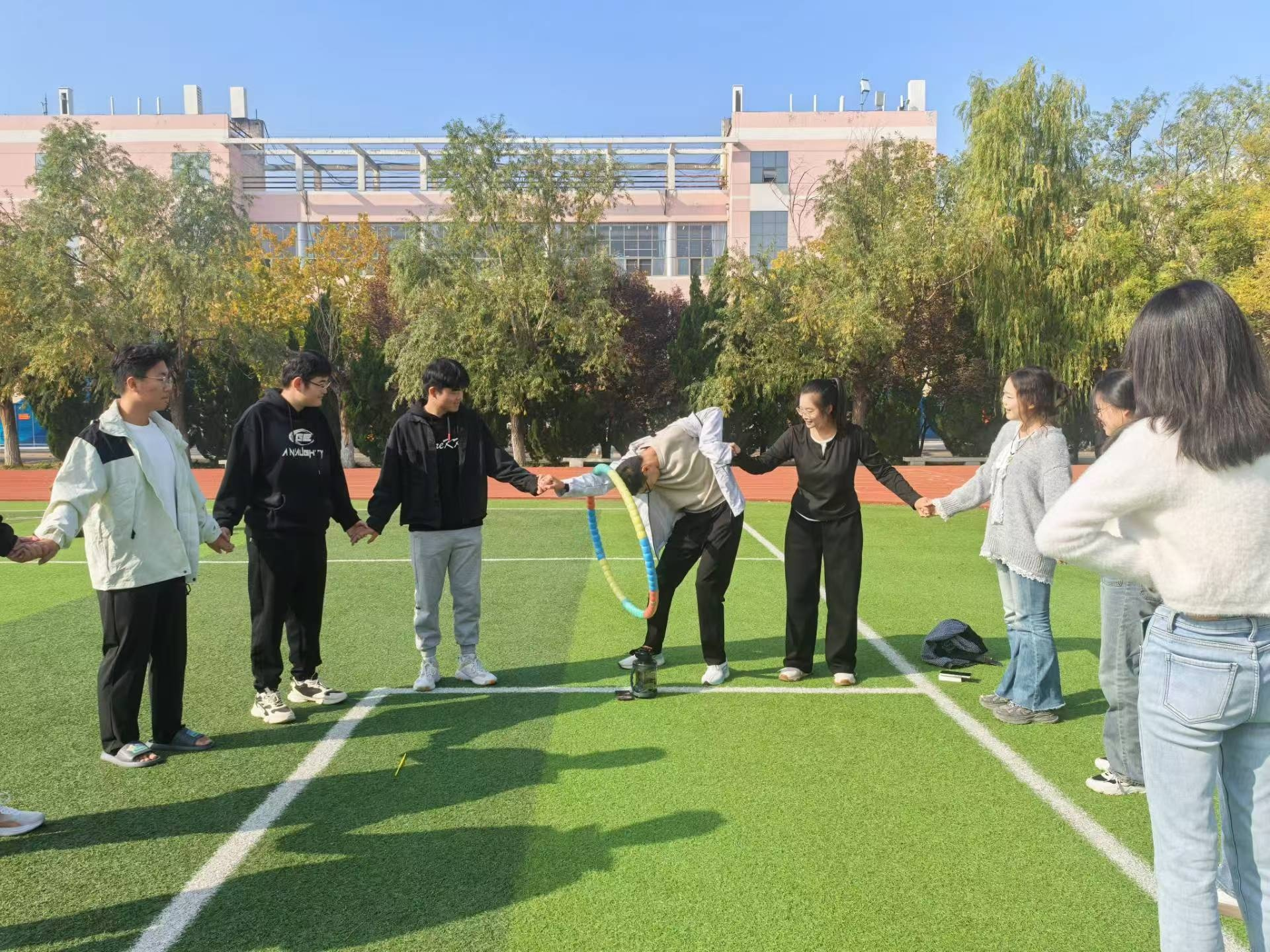 活动开始前,各班级负责人根据活动安排,组织并带领班级人员到校足球场集合,完成签到。活动开始后,各班按照具体任务分工,在各组长的带领下到达规定的场地开展心理团建游戏。投壶游戏、“绳”彩飞扬、呼啦圈传递、七人六足,一个多小时的活动中,同学们默契配合,将自身的激情散射在操场之上。辅导员老师与同学们一同参与游戏,拉进了师生距离,展现了良好的师生关系。
