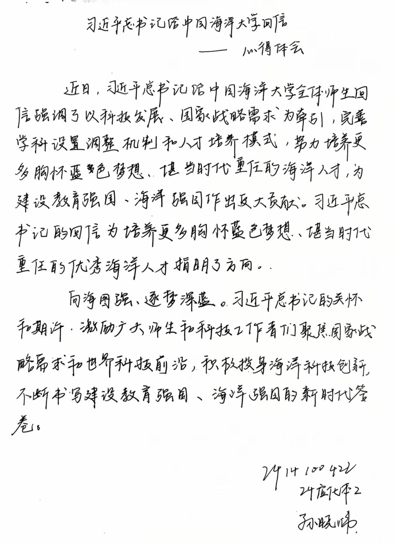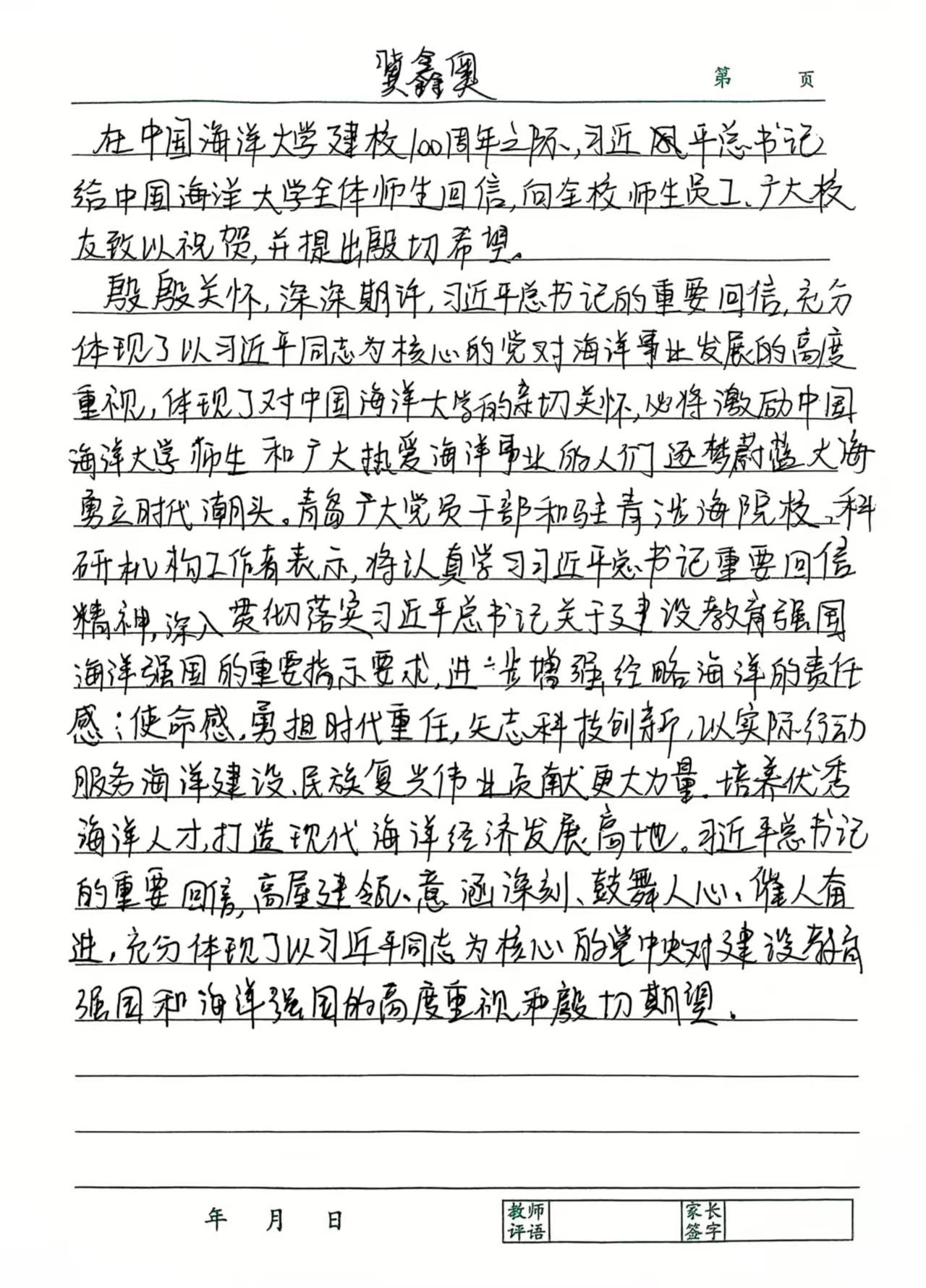 班会上,各班同学认真学习了习近平总书记给中国海洋大学全体师生的回信内容,深入领会其精神实质。通过详细的解读和关键词分析,同学们对回信中的核心思想有了深刻理解。习近平总书记的回信为高等教育的发展指明了方向,中国海洋大学等高校应以建校百年为新起点,积极响应国家战略需求,完善学科设置和人才培养模式,培养更多优秀的海洋人才,为教育强国和海洋强国建设贡献力量。