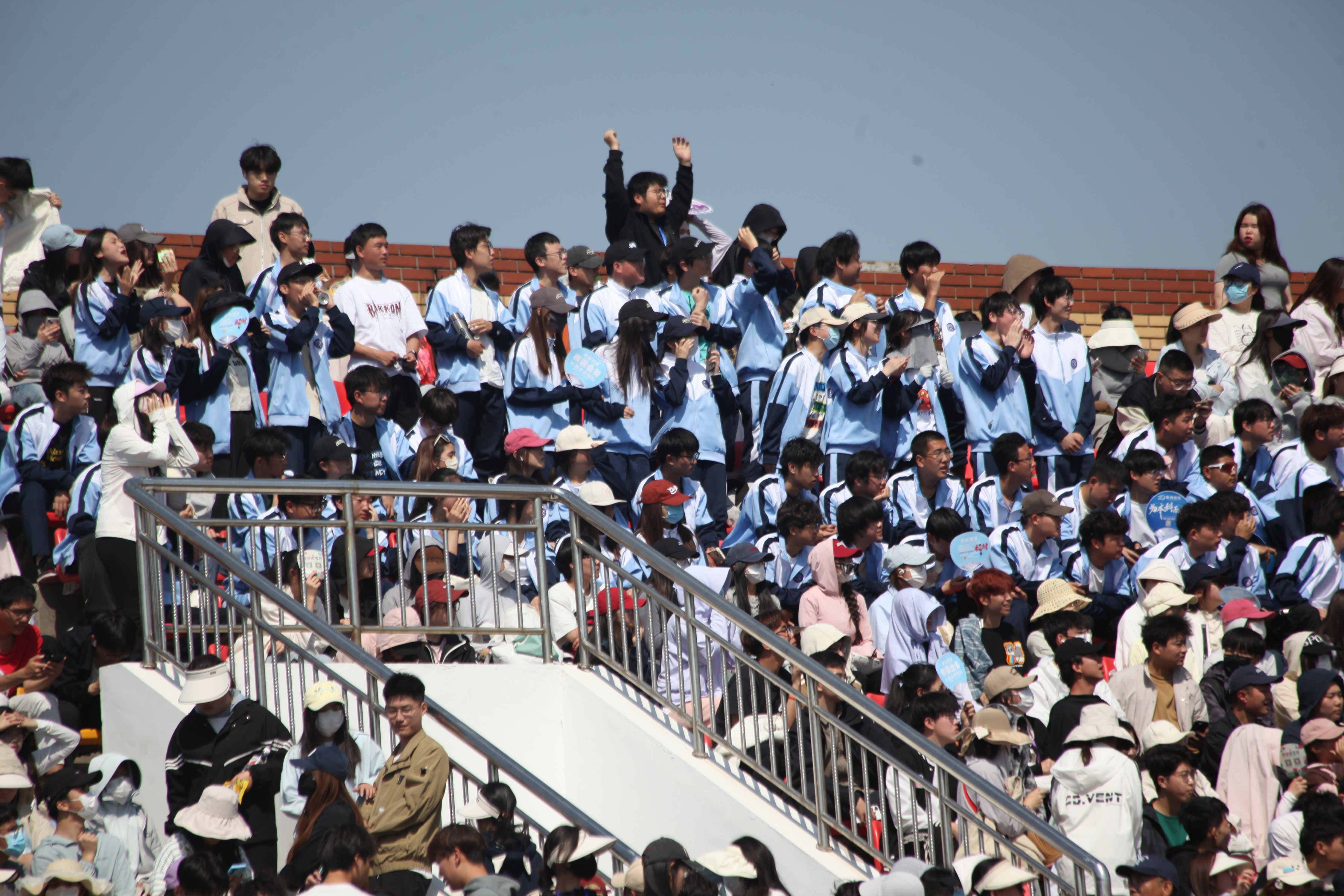 观众席上,由师生组成的“最强应援团”从未停歇。辅导员老师们带头呐喊加油,同学们挥舞院旗,声浪一波高过一波。这份双向奔赴的支持,正是化院精神的生动注脚。