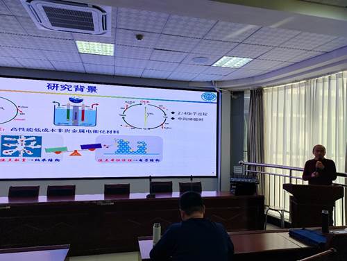宋学志副教授从电催化中的金属磷化物基催化材料、金属氢氧化物基催化材料、金属碳化物基催化材料等3个方面进行了深入的阐述。报告会后与部分教师进行互动,并提出具体建议。宋学志副教授还以自身经历与参会学生分享了如何进行科研选题、分析实验结果等内容。