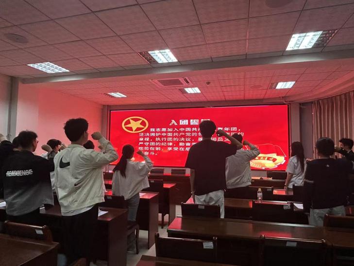 仪式在庄严的国歌声中拉开帷幕。全体人员起立,用激昂的歌声表达对祖国的热爱与对团组织的崇敬。随后,新团员们面向团旗庄严宣誓:“我志愿加入中国共产主义青年团……为共产主义事业而奋斗!”铿锵有力的誓言响彻教室,彰显出青年学子对共青团的坚定信仰与为党和国家事业贡献力量的决心。