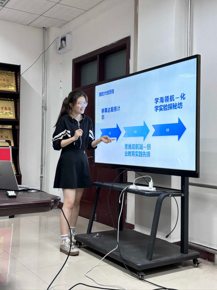校学生会科技创新部部长田振同学系统阐释了“互联网+”大学生创新创业大赛与“挑战杯”全国大学生系列科技学术竞赛的赛制框架。他围绕赛事分类、评审维度、项目孵化路径等关键环节展开剖析,结合兄弟院校优秀案例与我校实际情况进行对比分析,为大家厘清了备赛方向与策略重点。随后,校大学生创新创业孵化基地优秀项目负责人王玺同学作专题分享。她以第一视角复盘参赛历程,从团队构建、技术论证、商业计划书撰写到答辩技巧,全方位梳理实战经验。其分享既包含时间管理、跨学科协作等普适性方法,又针对化工学科特点提出专业建议使复杂内容易于理解。