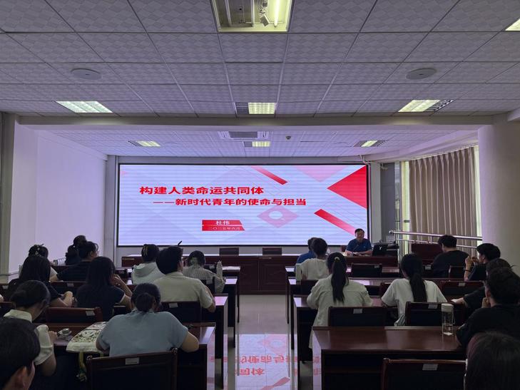 为深入推进思政教育,引导青年学子深刻领悟新时代使命担当,2025年6月24日,党委委员、副校长杜伟在9教 313 会议室,以 “构建人类命运共同体——新时代青年的使命与担当” 为主题,为我院联系党支部讲授专题思政课。